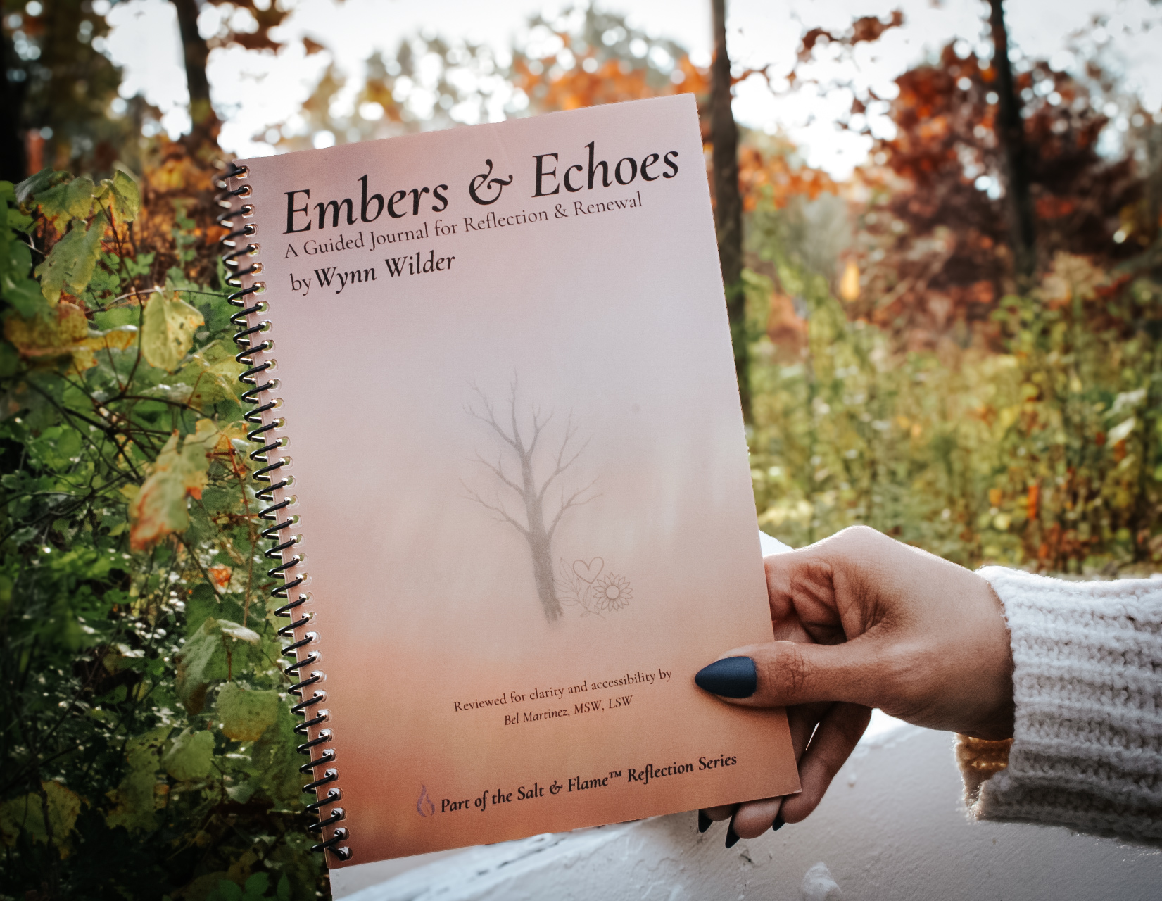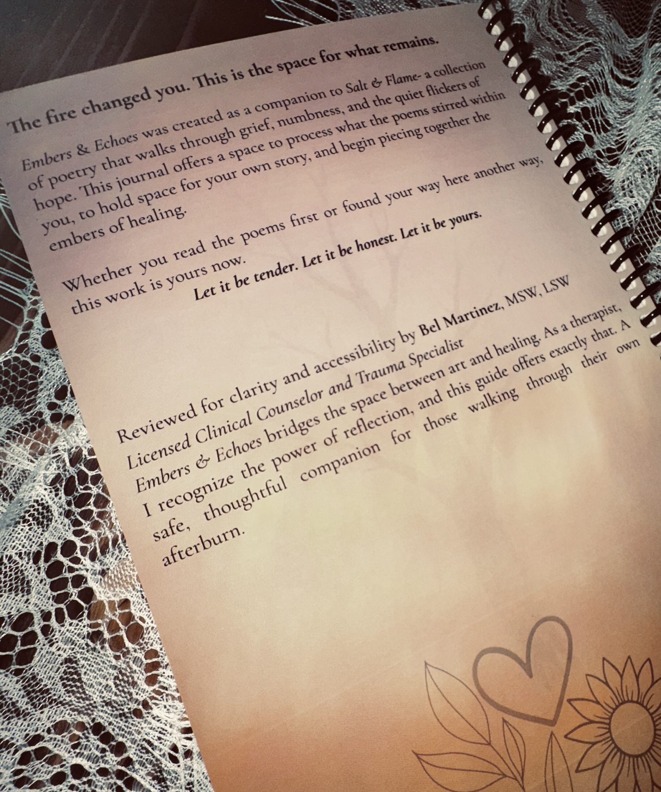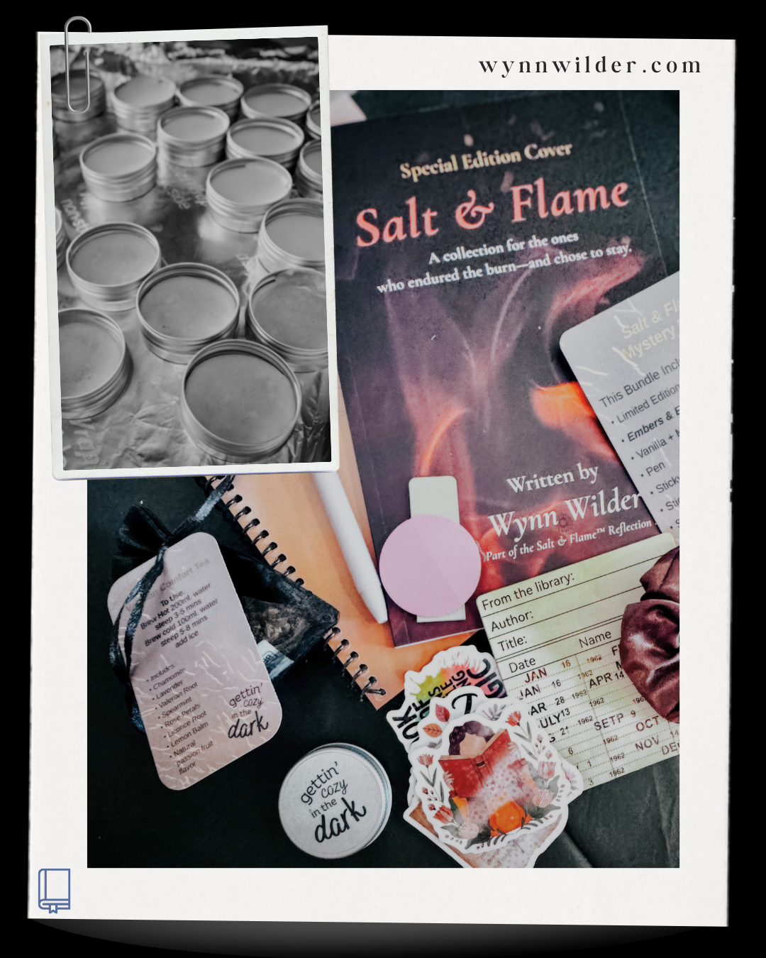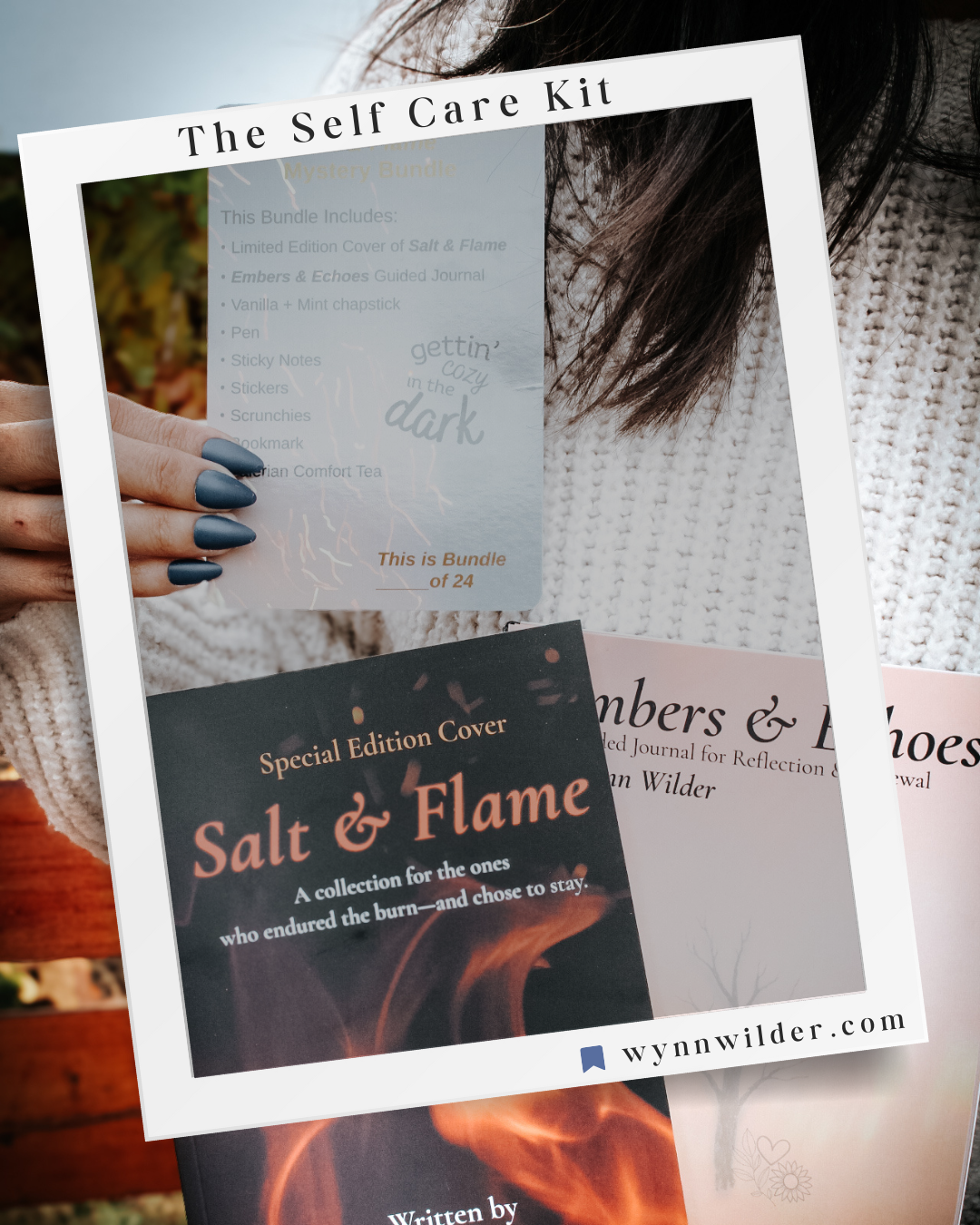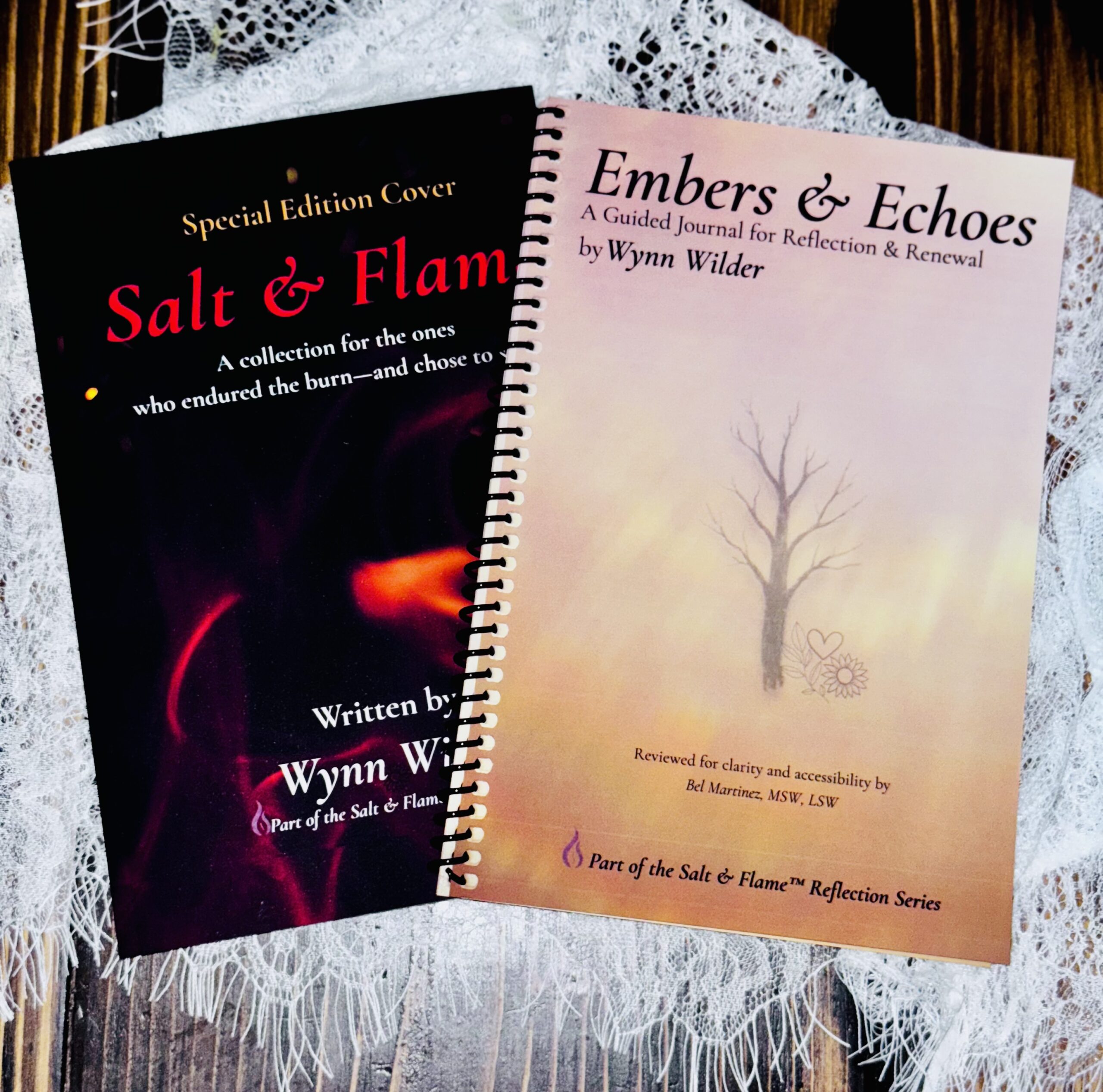 The Self – Care Kit was created to be both. Each set includes a limited-edition copy of Salt & Flame and the Embers & Echoes guided journal; a pairing meant to hold you gently through reflection, honesty, and healing.